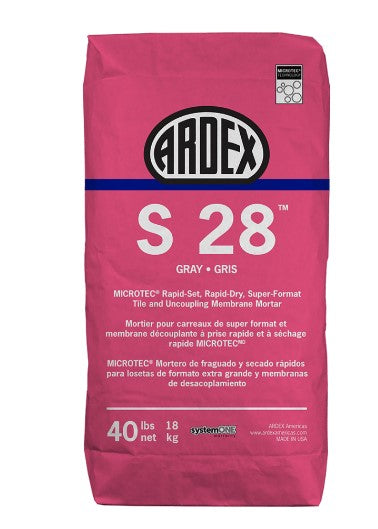 ARDEX S 28™ MICROTEC® Rapid-Set, Rapid-Dry, Super-Format Tile and Uncoupling Membrane Mortar is a high-performance, rapid drying and rapid hardening, microfiber-reinforced, polymer-modified tile and stone mortar for interior installations. ARDEX S 28 is highly flexible with virtually no shrinkage and has an extended open time, making it perfect for large and super-format tile and stone installations. Due to its semi-pourable consistency, ARDEX S 28 is excellent when used with ARDEX FLEXBONE® Uncoupling Membranes and other approved uncoupling membranes. ARDEX S 28 is ideal for moisture-sensitive tile and stone such as green and light marbles* because it is formulated with ARDEX proprietary self-drying technology where the mix water is completely bound into the matrix. This technology eliminates water evaporation, which virtually prevents staining and warping of moisture-sensitive tile and fully cures quickly between even the largest, most dense tiles and substrates.