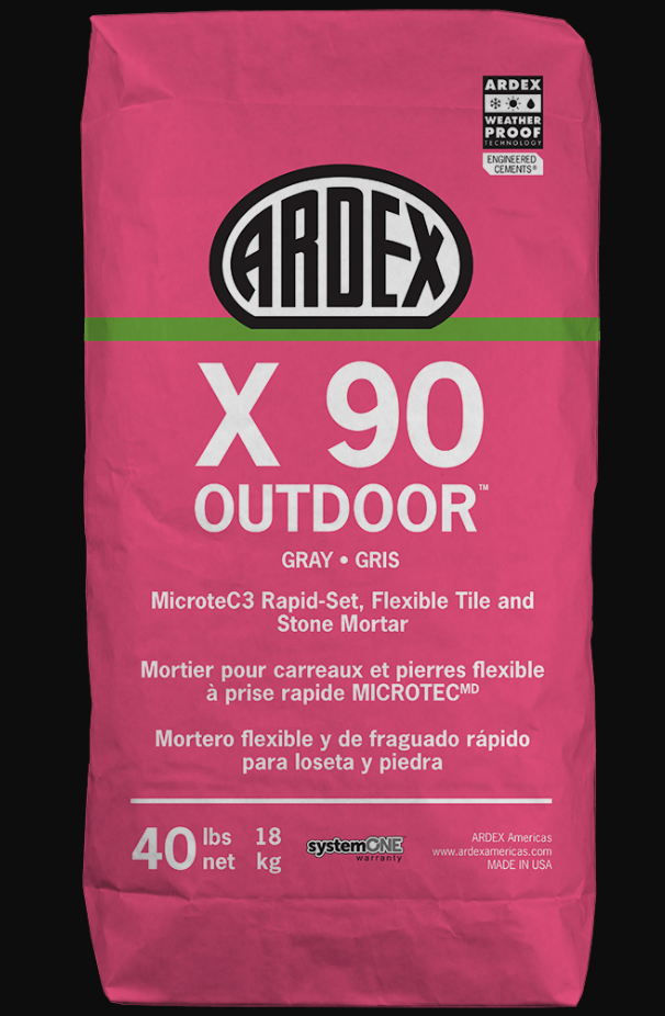 ARDEX X 90 OUTDOOR™ MicroteC3 Rapid-Set, Flexible Tile and Stone Mortar is a revolutionary innovation in mortar technology that is formulated with specialty, high-performance ARDEX cements, polymers and microfibers to deliver maximum protection against the harshest weather conditions and provide the highest levels of efflorescence resistance for exterior tile and stone applications. ARDEX X 90 OUTDOOR can be installed over substrates with temperatures as low as 40˚F (5˚C) and can withstand driving rains or be grouted in only 2 hours.